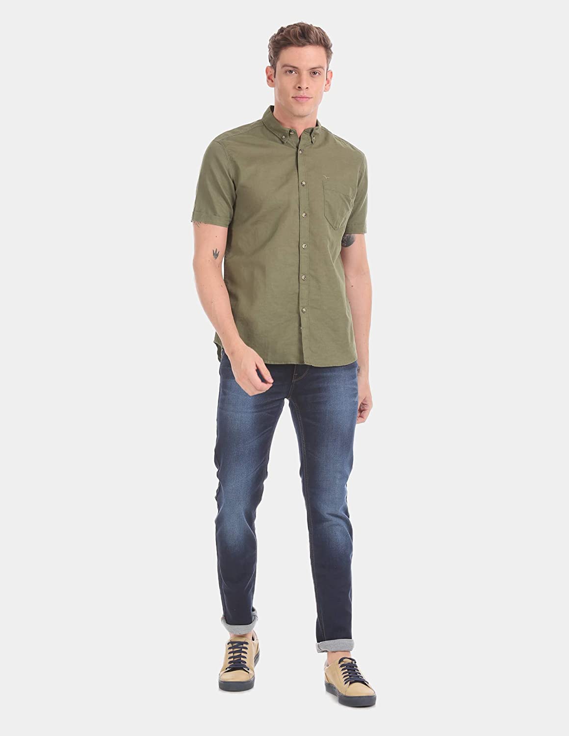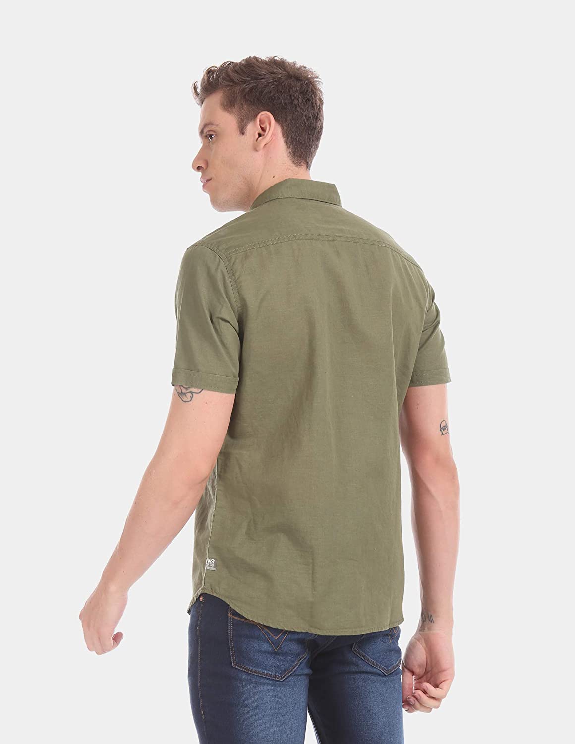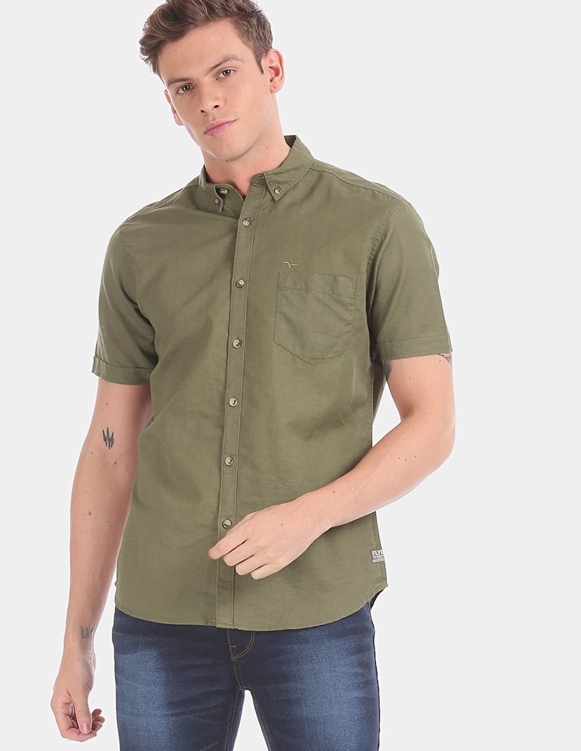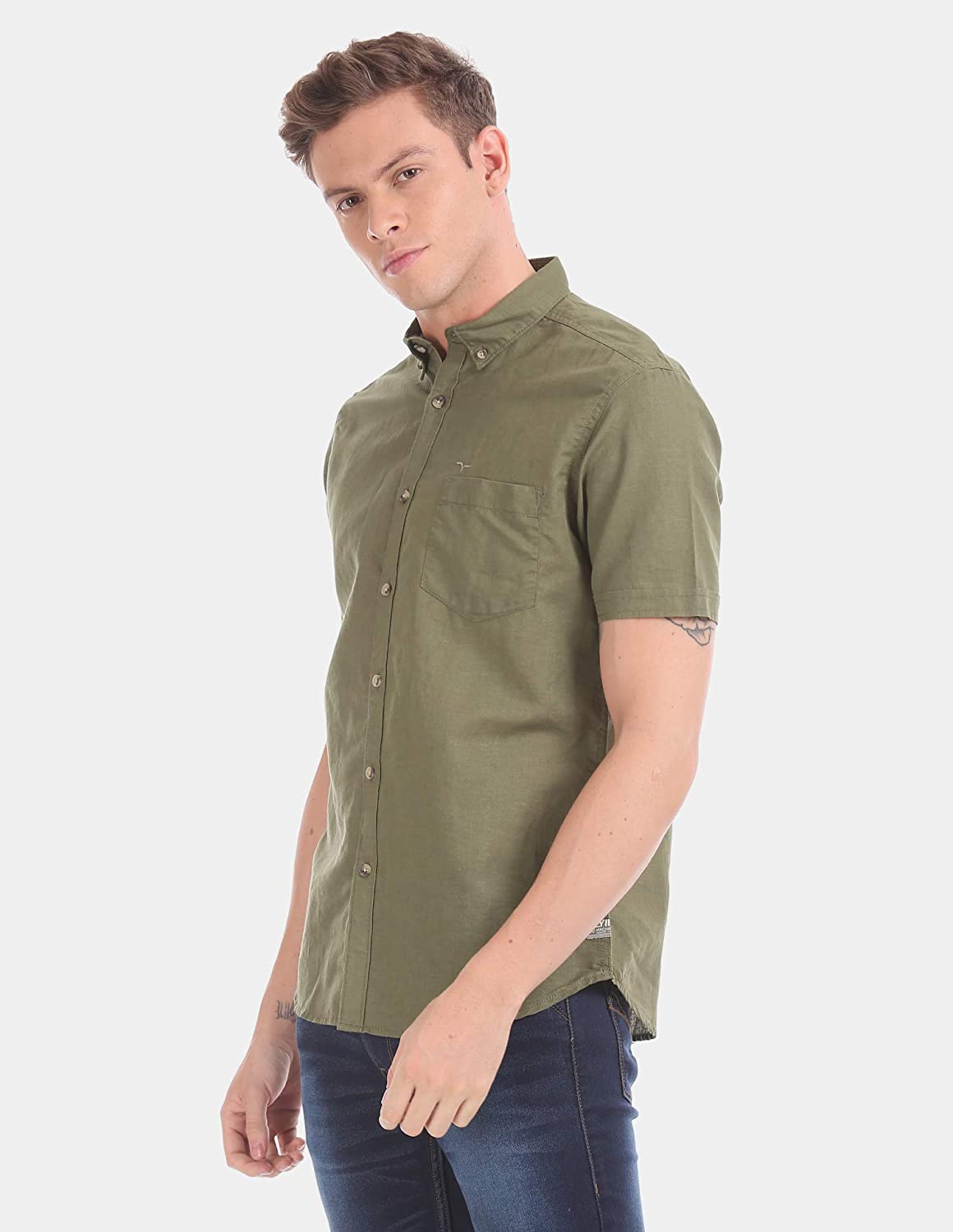 Flying Machine Men 66% Cotton, 34% Linen Solid Regular fit Green Shirt