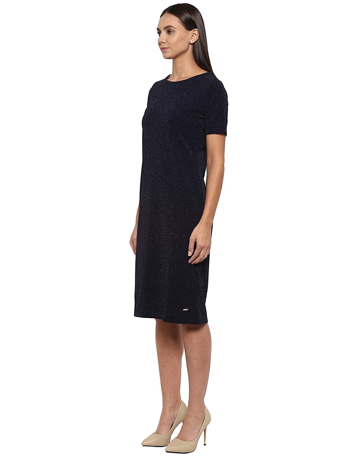 A perfect blend of royal charm and classy style, This Dark Blue dress from Park Avenue Women emerged in a beautiful silver speckled avatar. Designed with round neckline, half sleeves and straight-cut design, this dress also has metallic zipped fastener on the back that ensures snug fitting and a chic look. It will go well with a pair of pretty pumps.